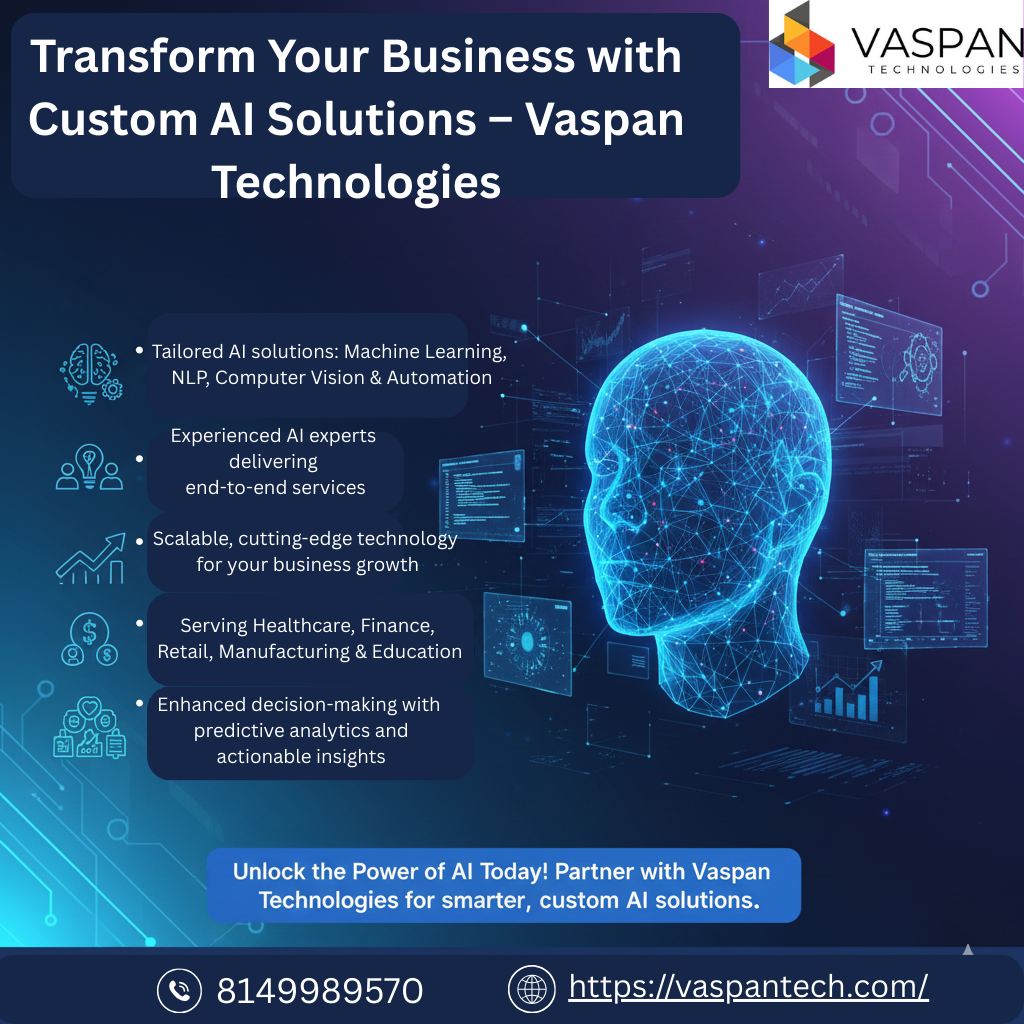 Boost your business with Vaspan Technologies, a top AI development company in India and USA. We deliver custom artificial intelligence solutions like Machine Learning, NLP, Computer Vision, and Intelligent Automation to help your business grow smarter, faster, and more efficiently.