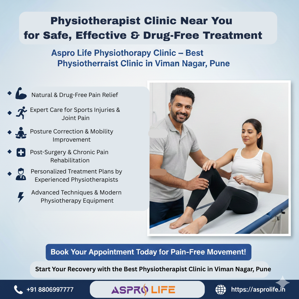 Looking for a physiotherapist clinic near you? Aspro Life Physiotherapy Clinic, the Best Physiotherapist Clinic in Viman Nagar, Pune, offers safe, effective, and drug-free treatment for back pain, neck pain, joint pain, sports injuries, post-surgery recovery, and chronic conditions. Our experienced physiotherapists provide personalized care with advanced techniques and modern equipment, helping you regain mobility, reduce pain, and improve your quality of life. Book your consultation today!