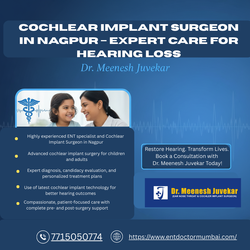 Consult Dr. Meenesh Juvekar, a renowned ENT specialist and Cochlear Implant Surgeon in Nagpur, offering advanced hearing solutions for children and adults. With expert diagnosis, latest cochlear implant technology, and personalized care, he helps patients regain hearing and improve quality of life. Book your consultation today for trusted and compassionate hearing care.Cochlear Implant Surgeon in Nagpur – Expert Care for Hearing Loss https://www.entdoctormumbai.com/FAQ Consult Dr. Meenesh Juvekar, a renowned ENT specialist and Cochlear Implant Surgeon in Nagpur, offering advanced hearing solutions for children and adults. With expert diagnosis, latest cochlear implant technology, and personalized care, he helps patients regain hearing and improve quality of life. Book your consultation today for trusted and compassionate hearing care.0 0 Reacties 0 Aandelen