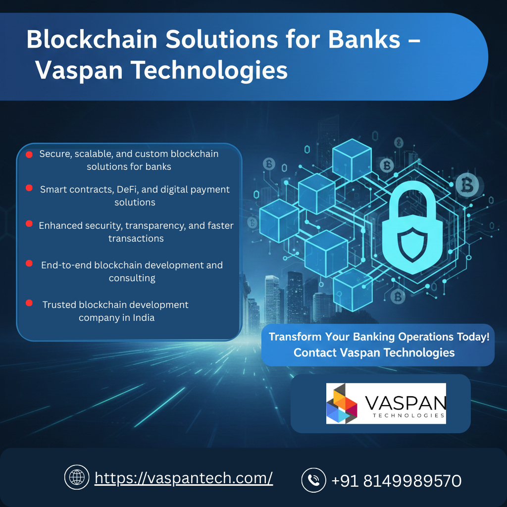 Power your banking innovation with Vaspan Technologies, a leading blockchain development company in India. We offer secure, scalable, and custom blockchain solutions for banks, including smart contracts, decentralized systems, and transparent transaction platforms. Improve security, reduce costs, and streamline banking operations with expert blockchain development. Get in touch with Vaspan Technologies today!