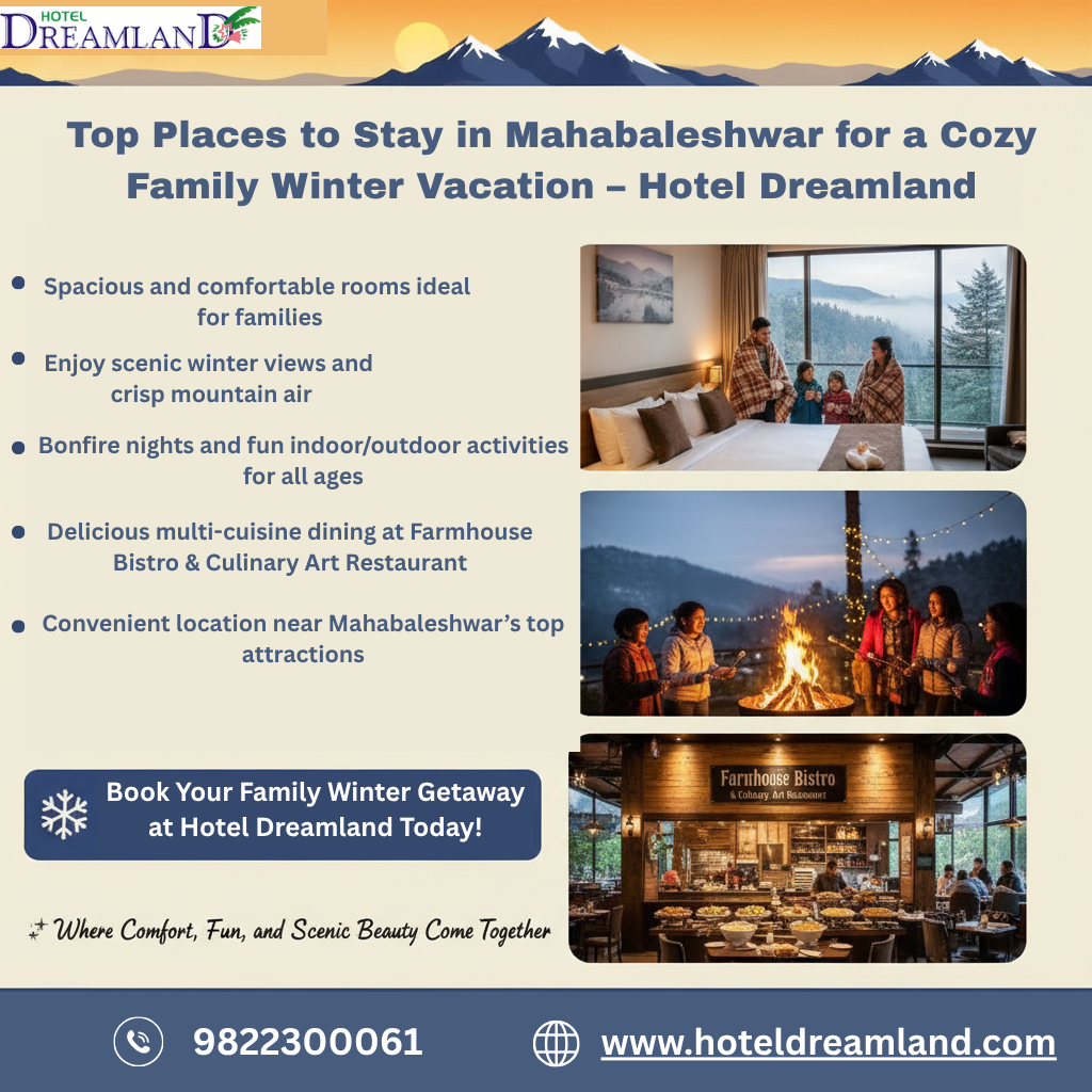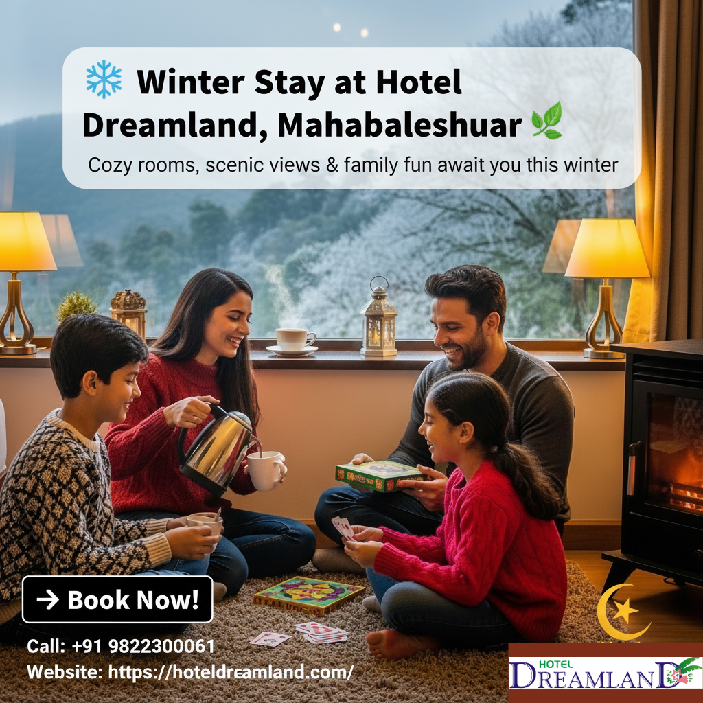 Looking for the perfect stay in Mahabaleshwar for your family this winter? Hotel Dreamland offers cozy rooms, lush green surroundings, and warm, family-friendly hospitality. Enjoy fresh vegetarian meals made from organic farm produce and taste pure, hotel-made honey. Perfect for families seeking relaxation, fun, and unforgettable holiday memories.