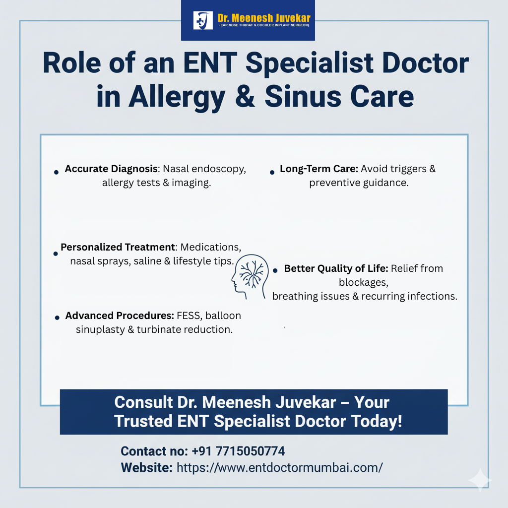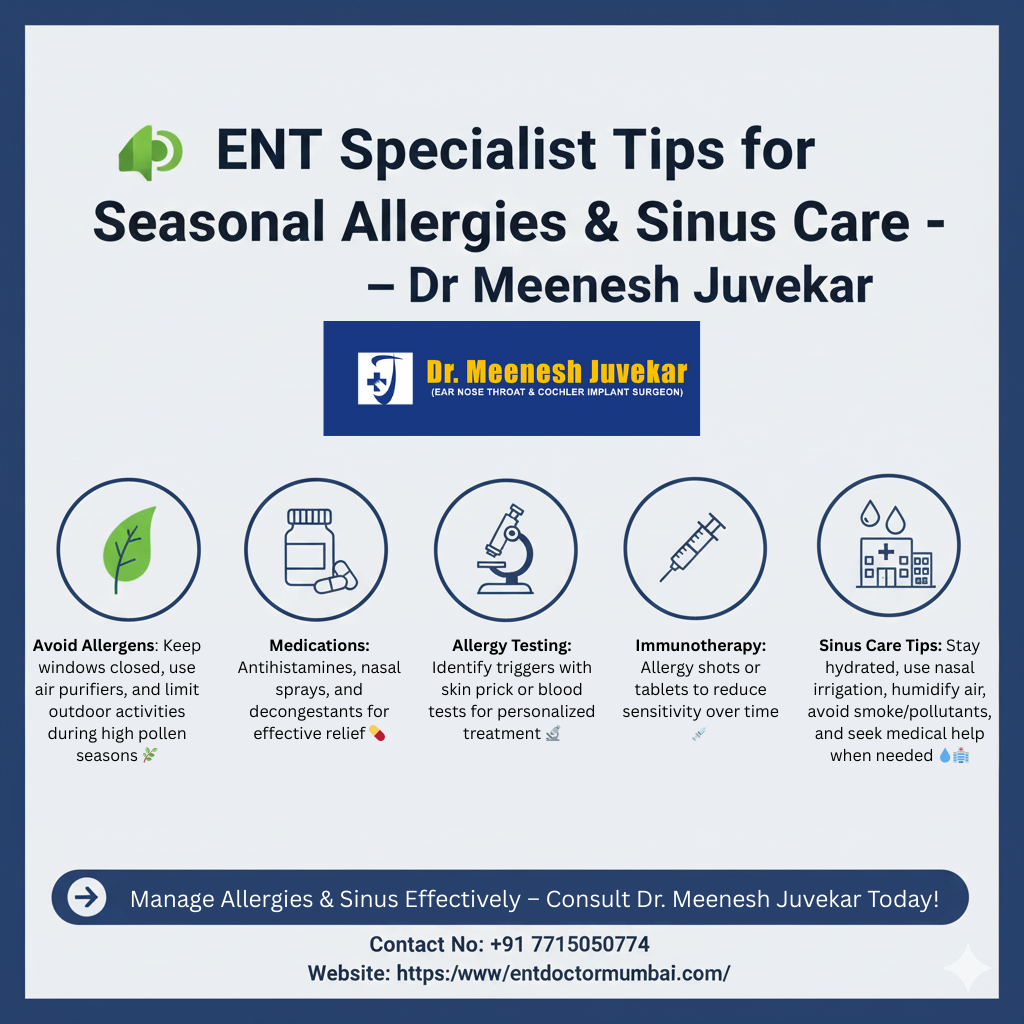 Suffering from seasonal allergies or persistent sinus problems? Get trusted care from Dr. Juvekar, a reputed ENT specialist with years of experience. Discover proven tips to manage symptoms and breathe easy again: from avoiding triggers and using effective medications, to undergoing allergy testing and following expert sinus‑care advice.