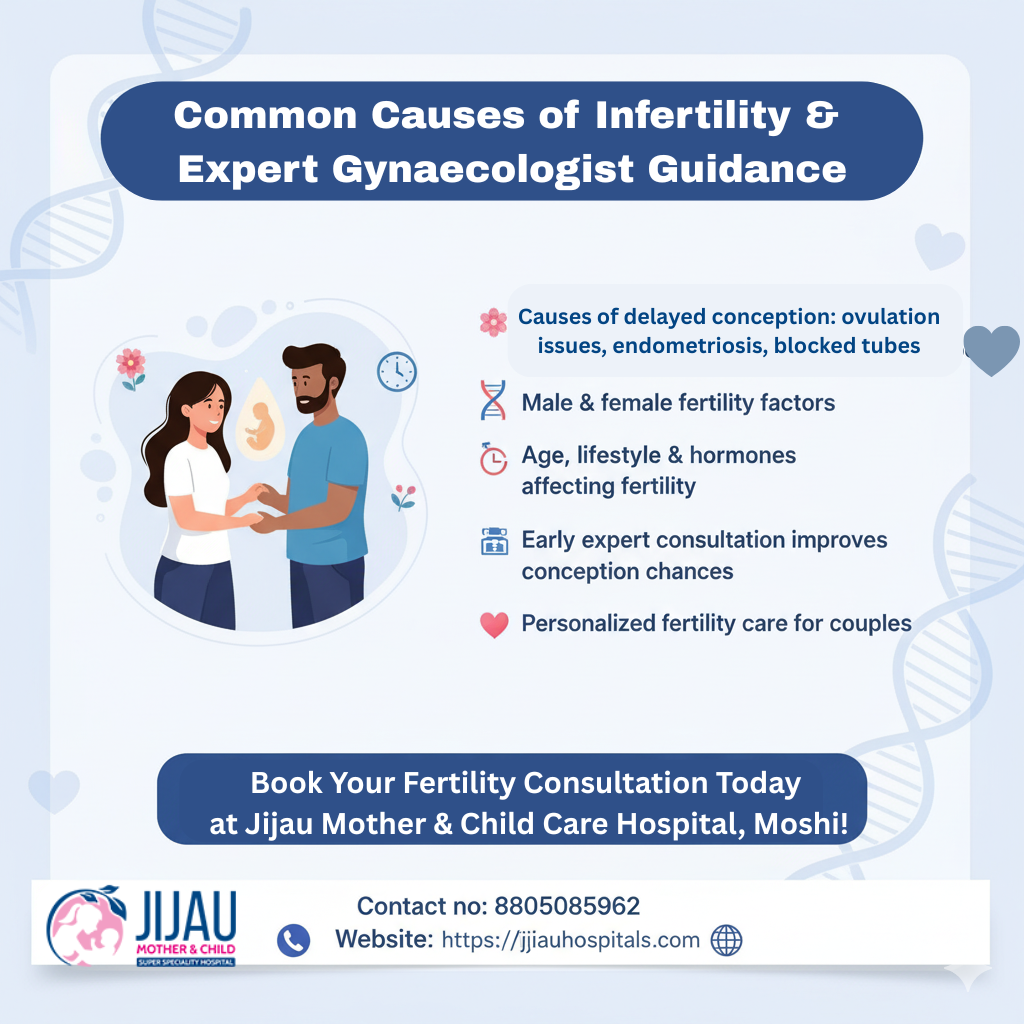 Located in Moshi, Pune, Jijau Mother & Child Care Hospital offers expert care for women facing fertility challenges. Learn about common causes of infertility such as ovulation issues, blocked tubes, endometriosis, and hormonal or lifestyle factors. Receive personalized treatment plans and compassionate guidance to improve your chances of conception.
