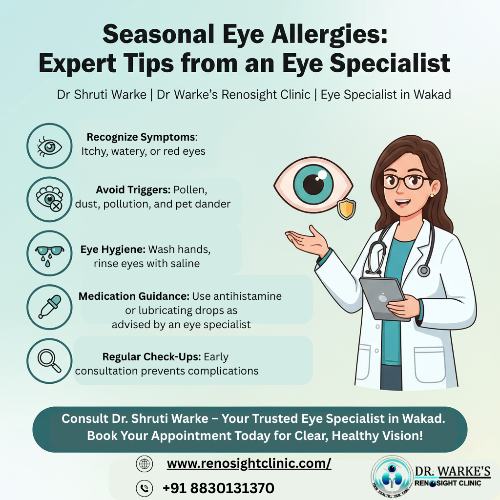 #EyeSpecialistInWakad #SeasonalEyeAllergies #DrShrutiWarke #RenosightClinic #HealthyEyes #EyeCareTips #AllergicConjunctivitis #VisionCare #WakadClinic #EyeHealth
